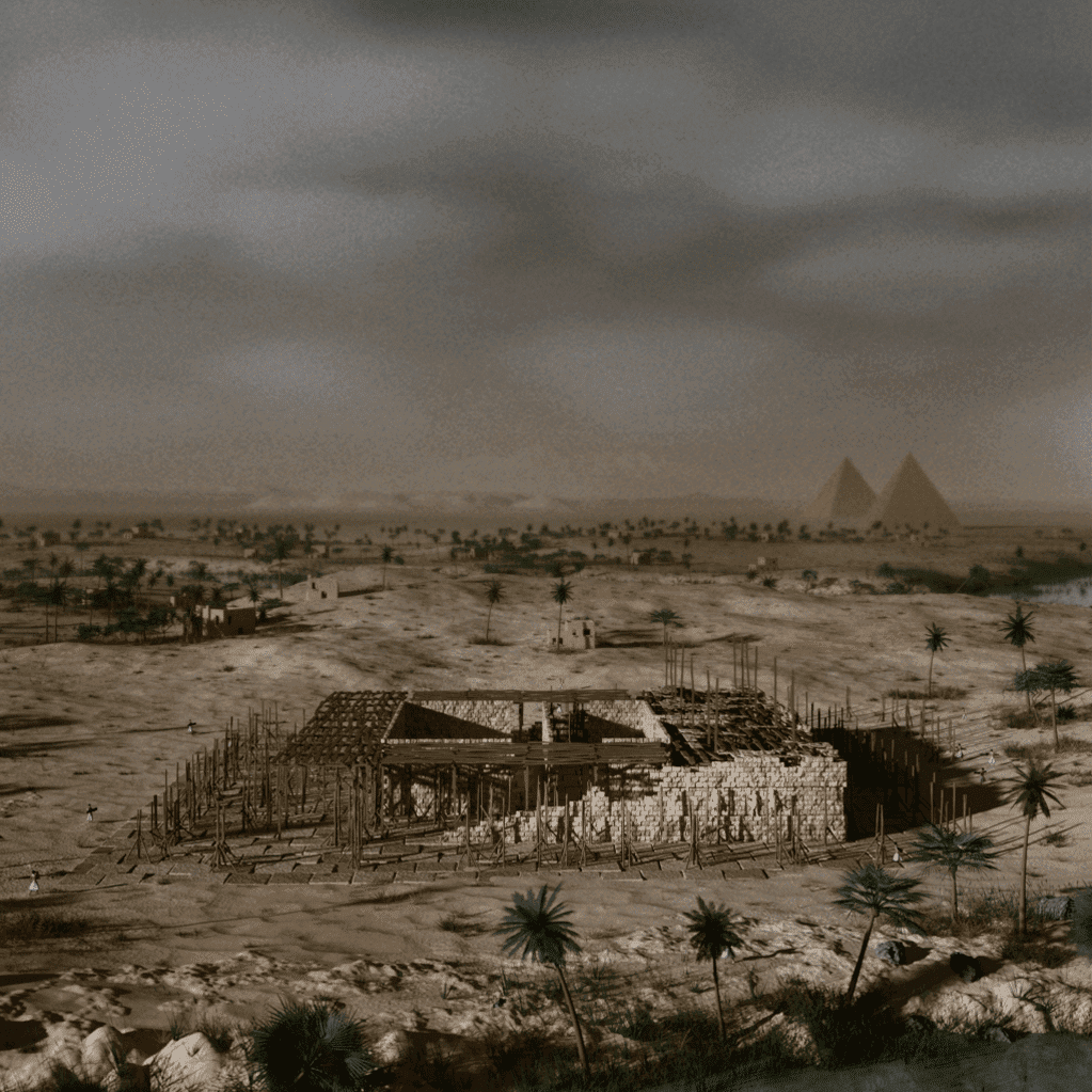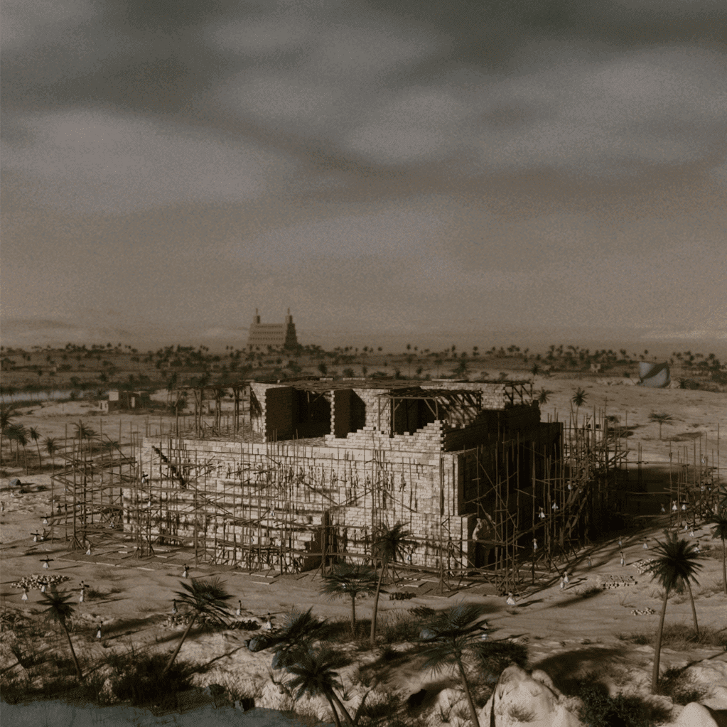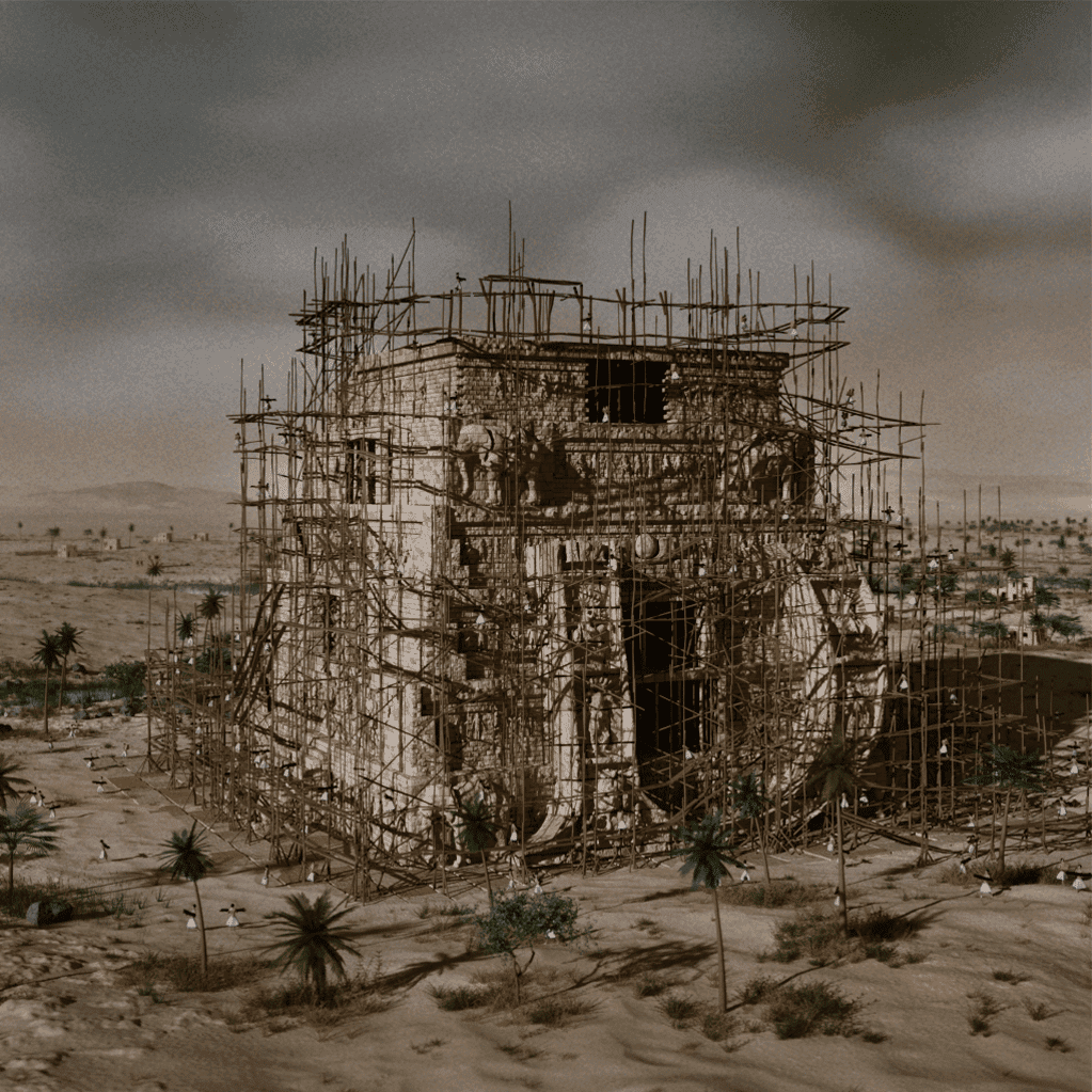 In our film, the narrative is divided into three acts, each one exploring a different stage in the story: the building of the tower, its destruction and the landscape left behind. It follows the tower from a single point of view, through a 360 degree camera move. We used a grainy print-like texture and monochromatic shading in the sky to create a darkness and drama within the events that unfold - inspired by Basoli’s print.