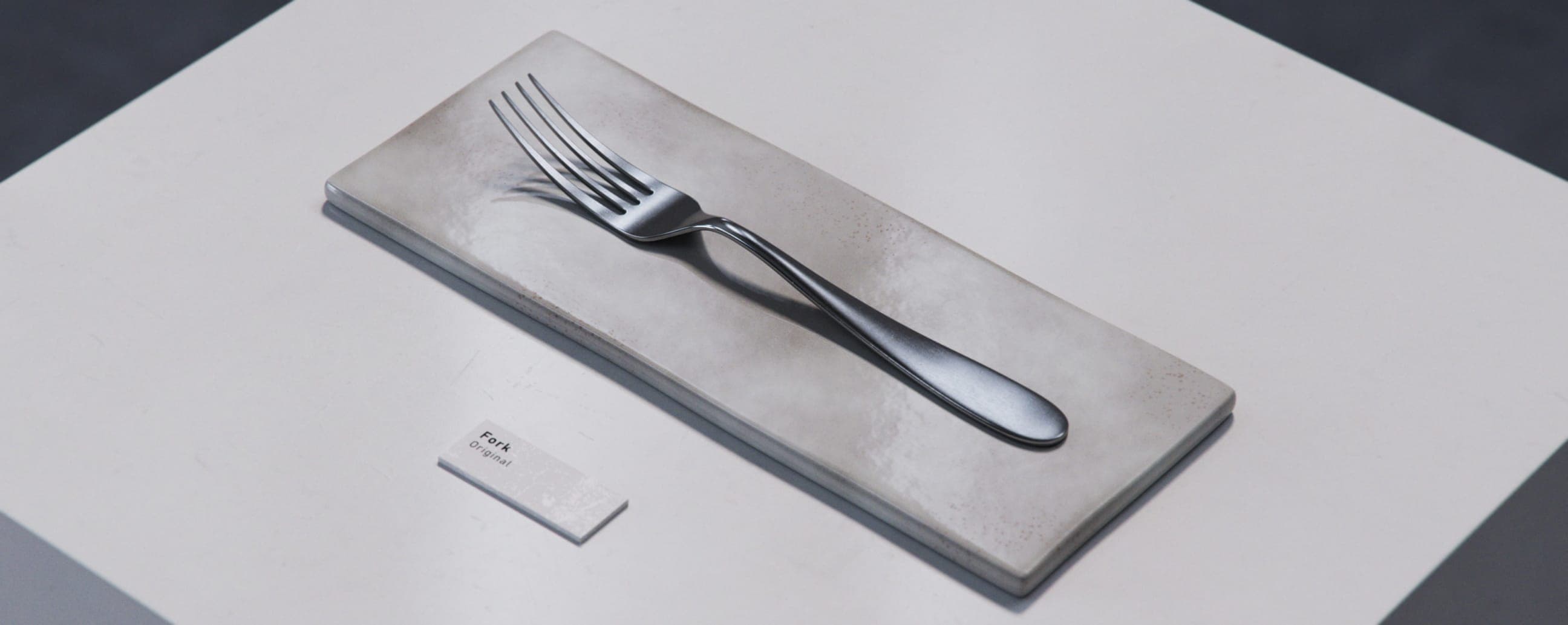 In a museum, a woman looking at a Fork exhibited as a piece of Art lets her imagination run wild.