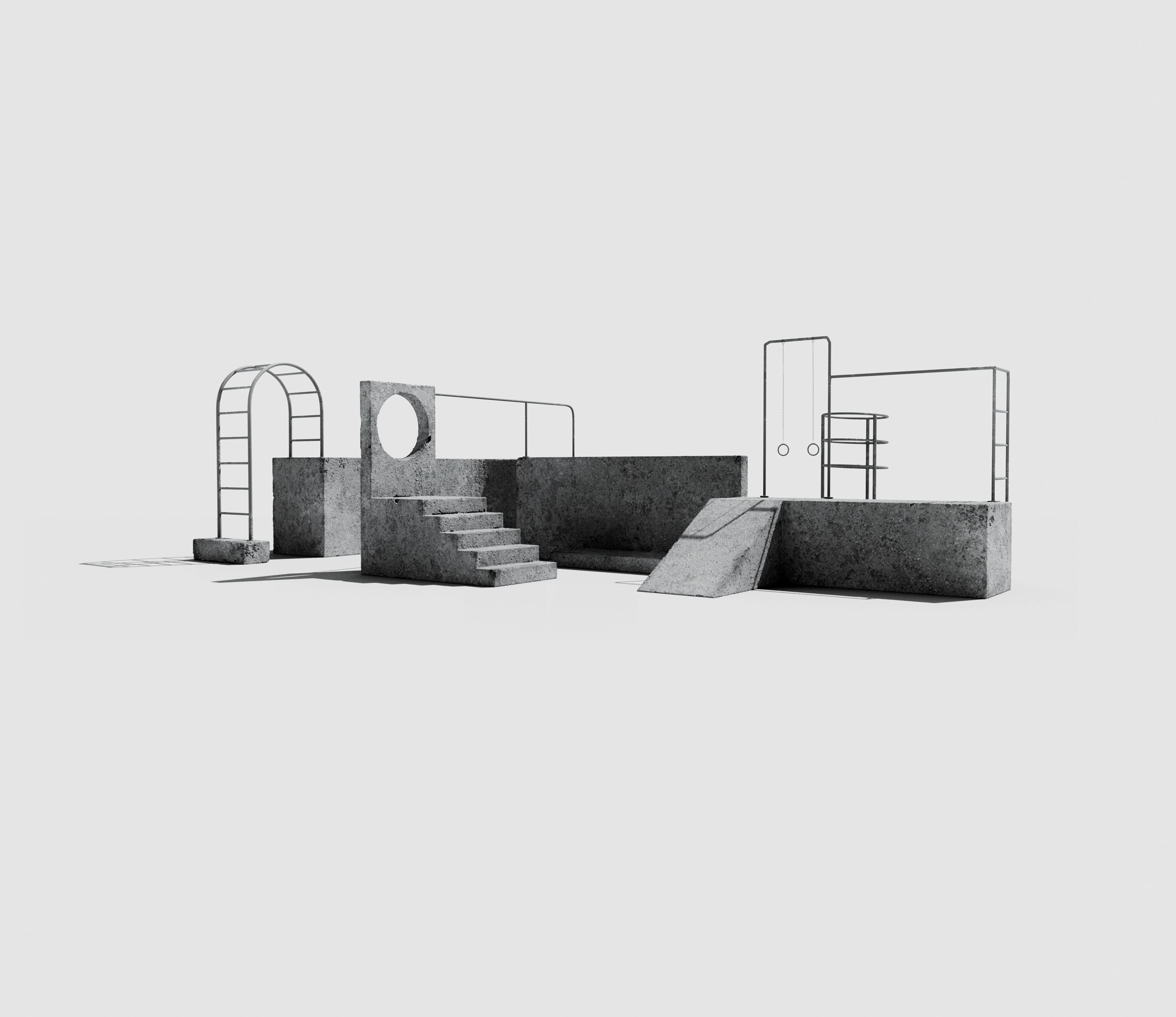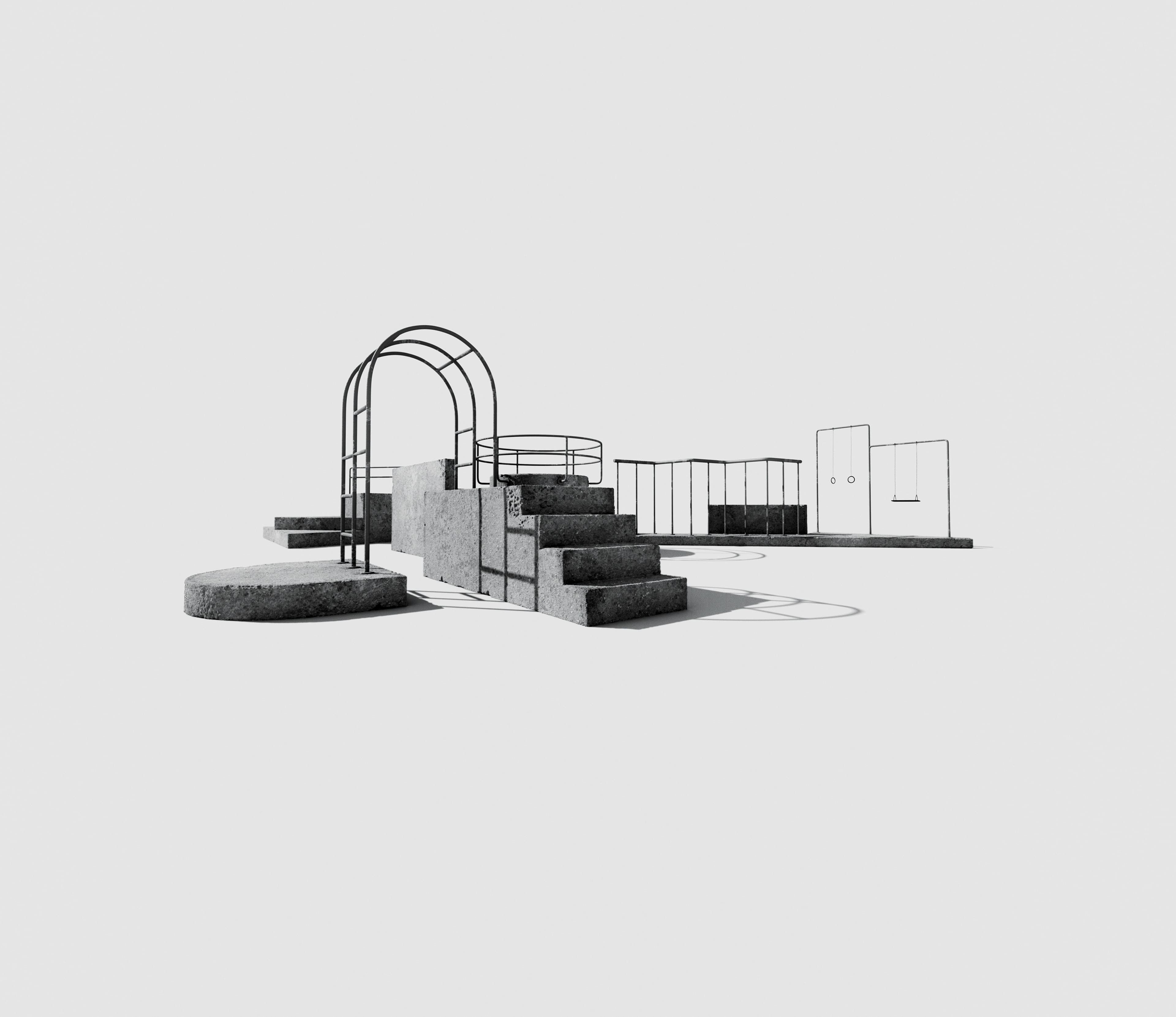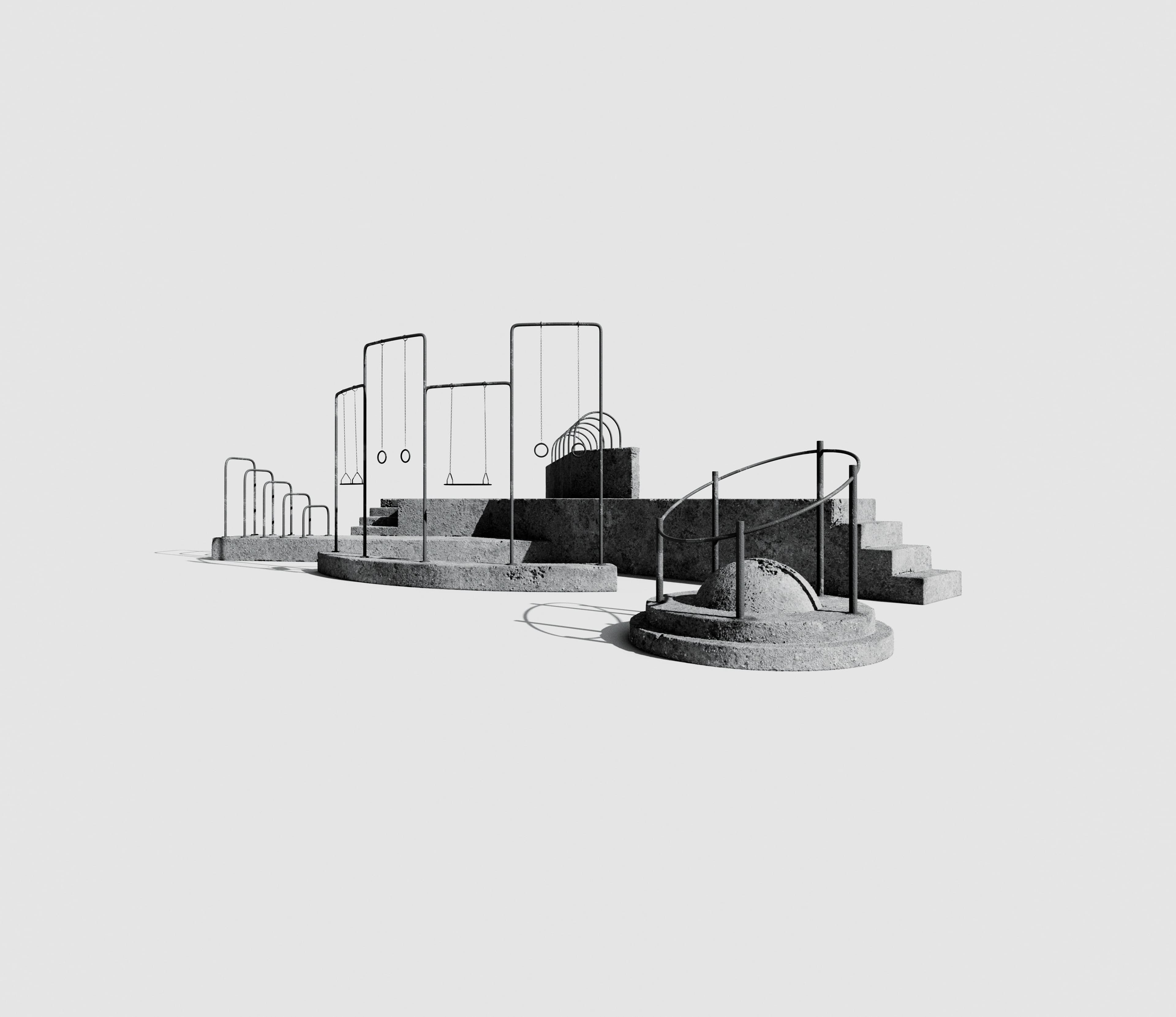 Taken away from their original contexts, these structures, once representing a world of fun and possibility, become simple arrangements of sculptural forms. Using light as a catalyst, we play with the interaction of shapes and shadows to reveal their architectural nature. We contemplate these now lifeless kids’ playgrounds through the nostalgic view of an adult. For a brief moment, the past and present are reunited together.
