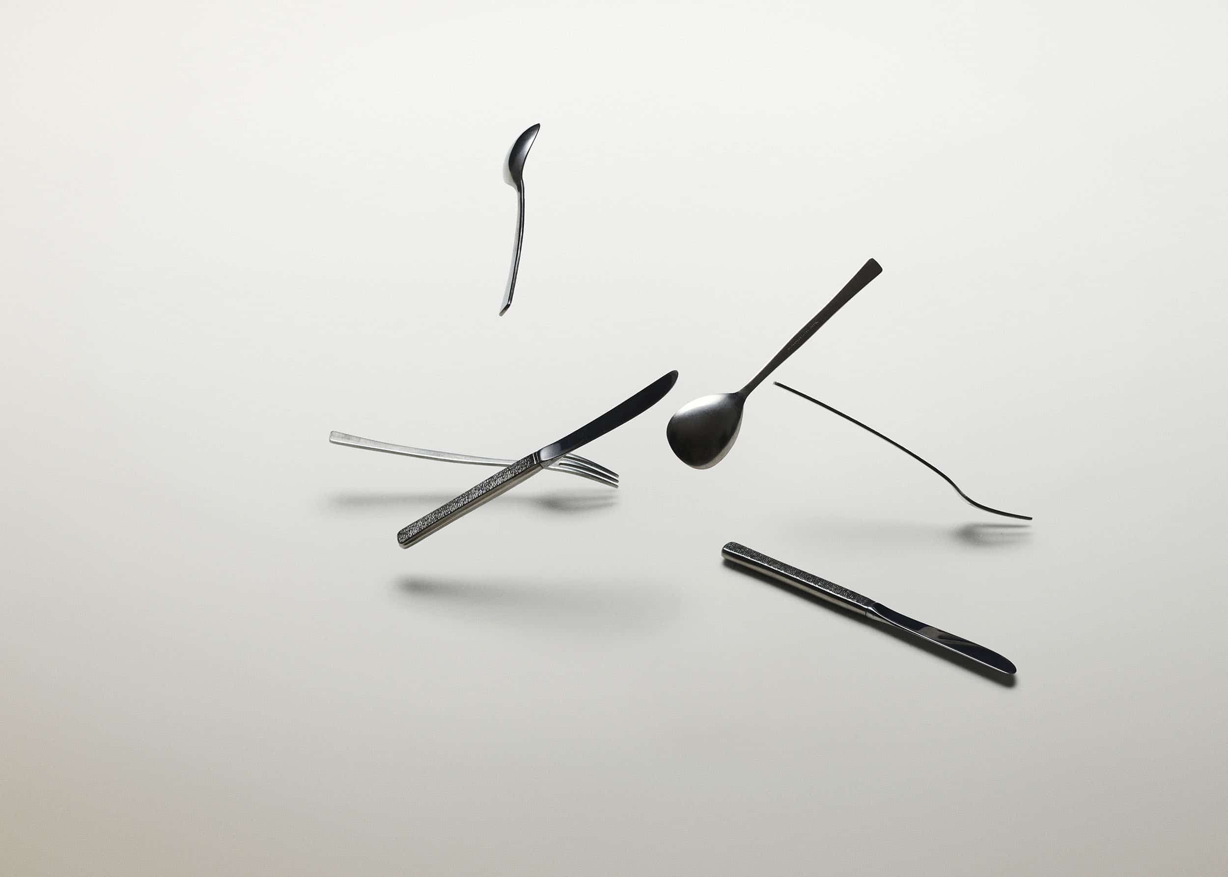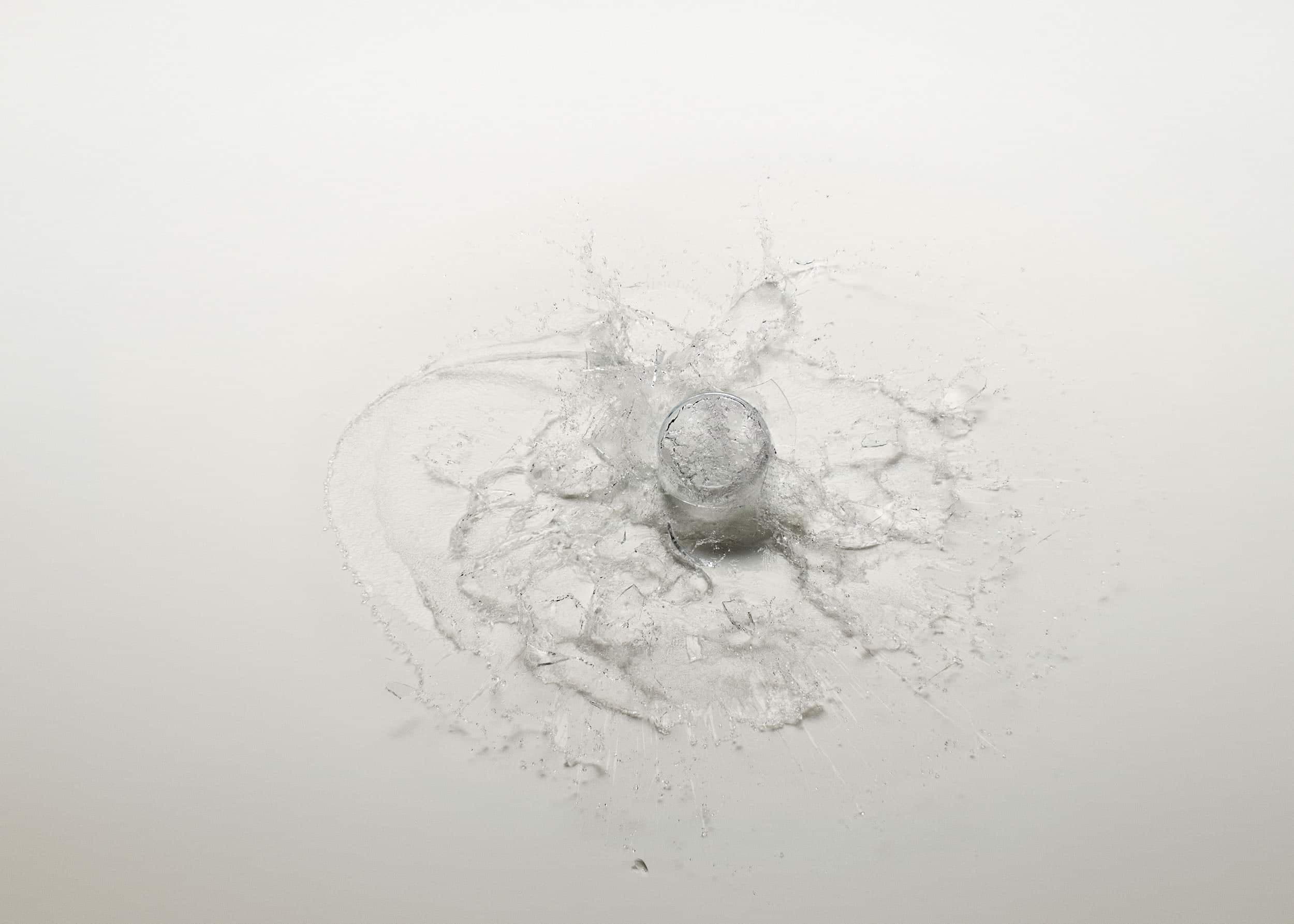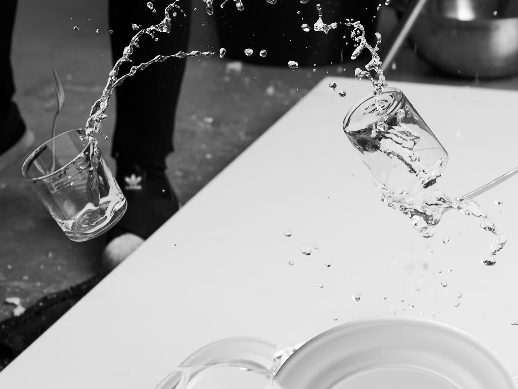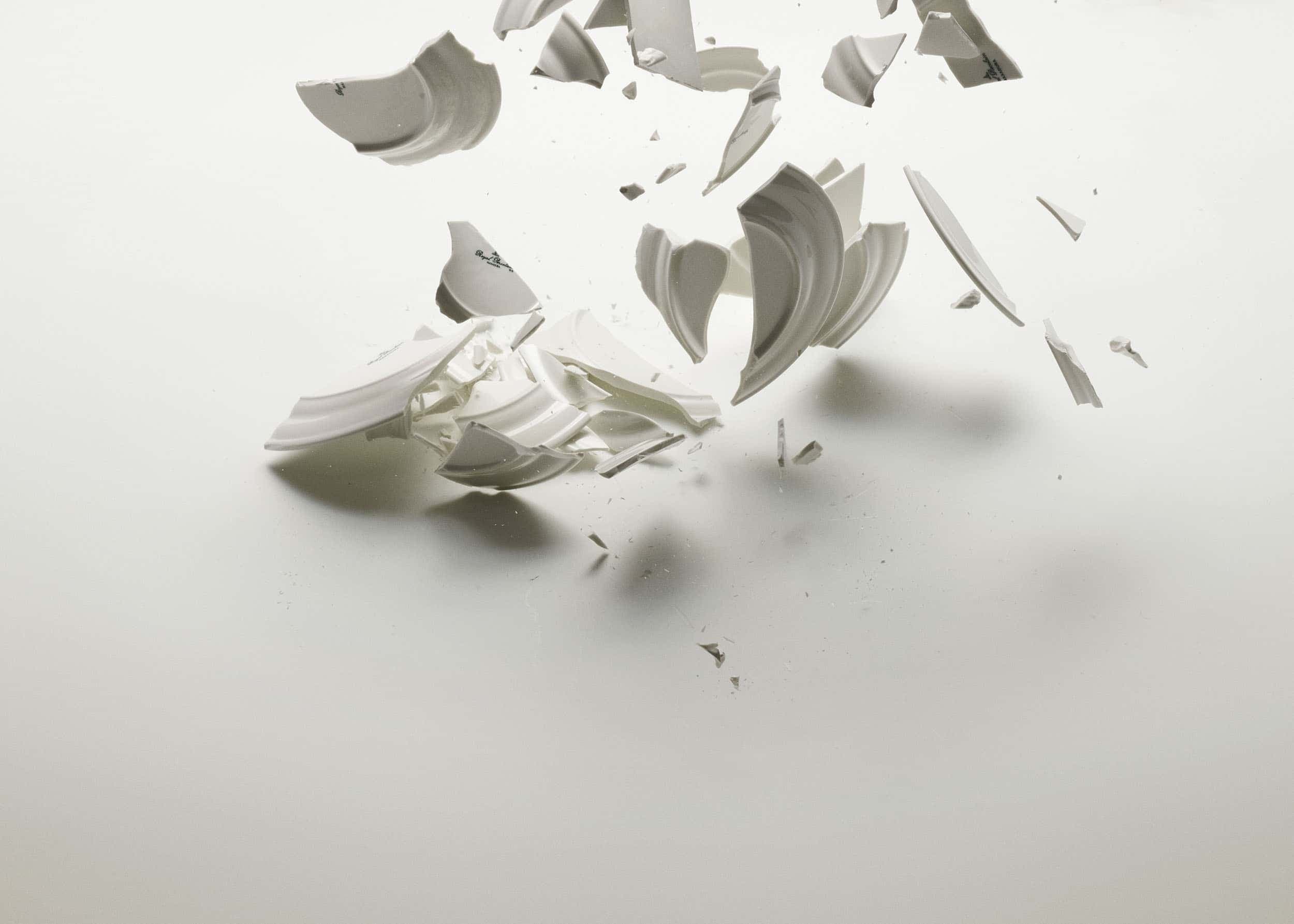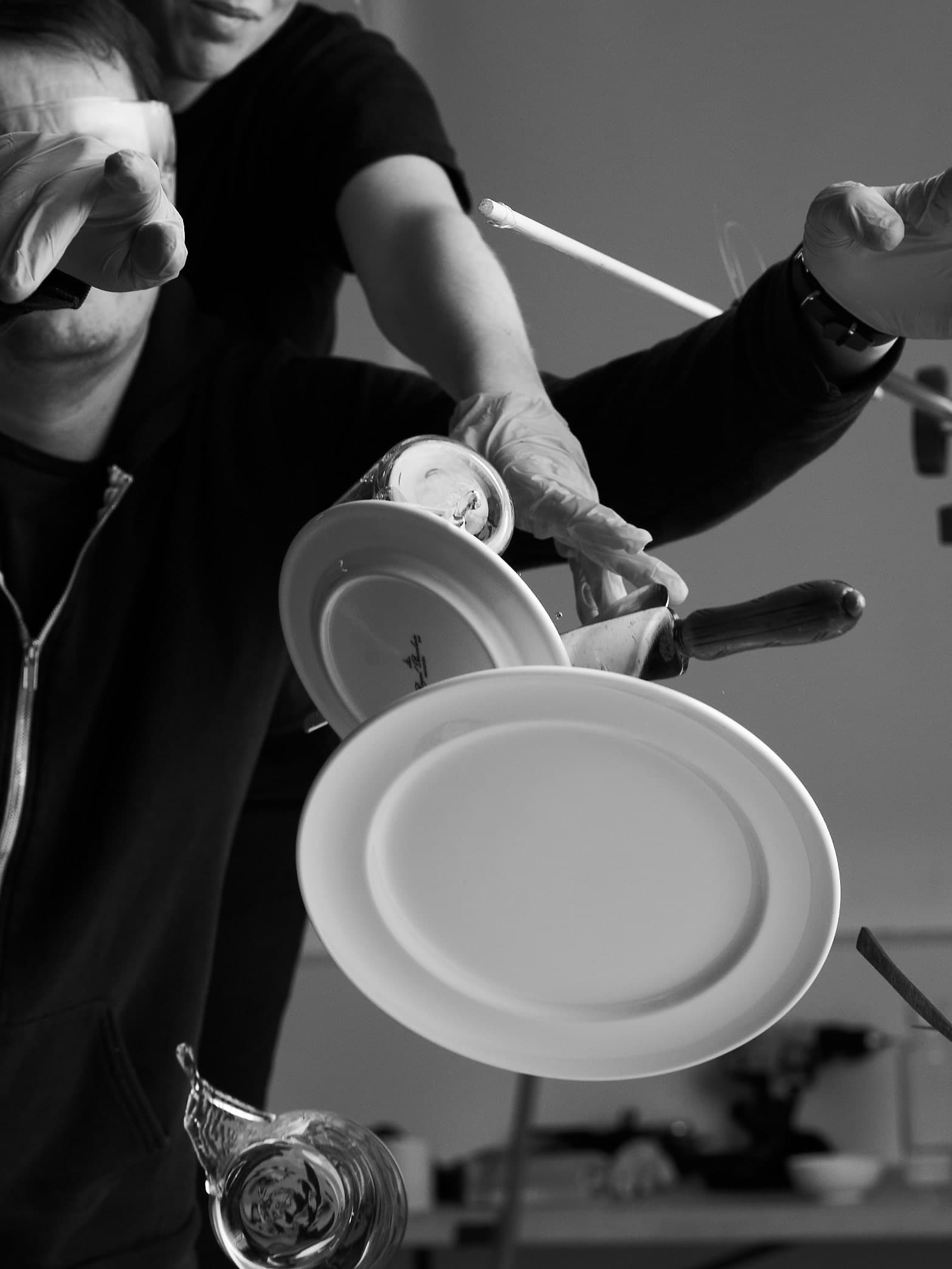 Specialist rigs were created by Asylum SFX for the larger compositions to create the eruption of large table settings. These rigs had to allow careful set dressing at a manageable height prior to a controlled winch to the release level. The surface for these larger table settings was dropped simultaneously with the objects which in turn created a dampening effect. To minimise this, the rigidity of the surface was increased considerably enabling a greater energy transfer directly to the objects on their initial impact, causing the materials to fracture violently on contact.
