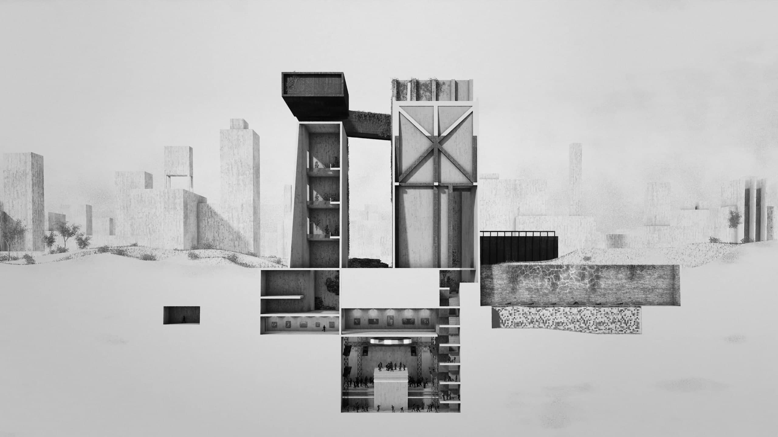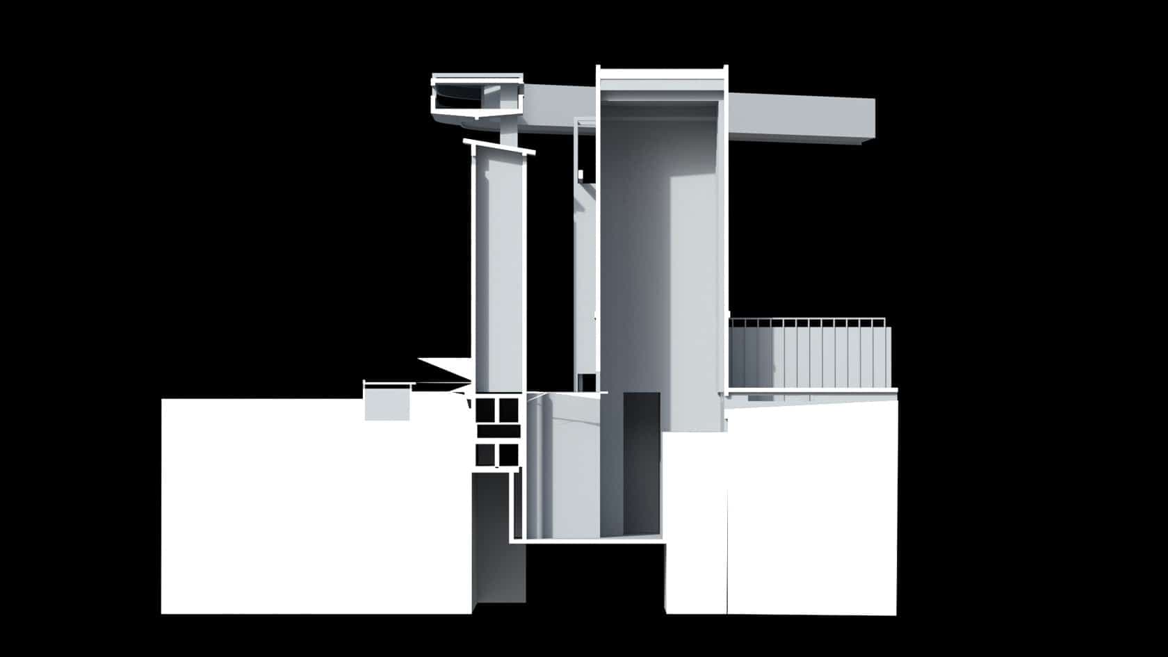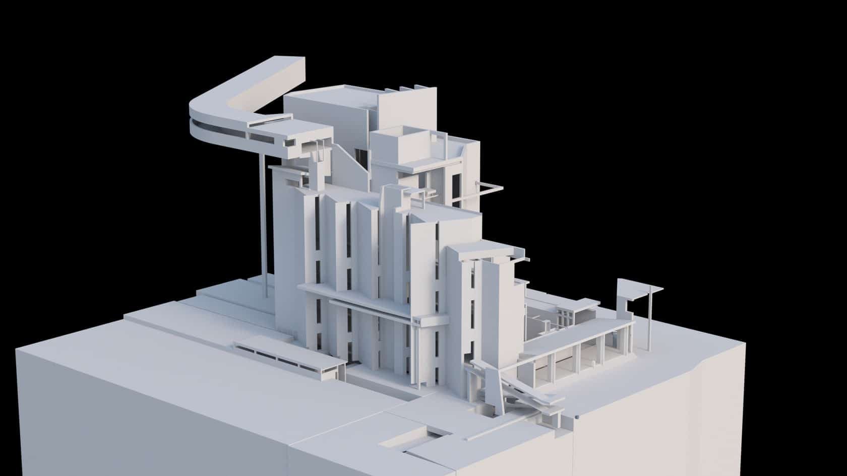 A journey through an imaginary Mausoleum in Chandigarh, Le Corbusier’s modernist city in Northern India. Utopia is a short film using a cross section view. This perspective is used exclusively as we follow the characters enigmatic journey as they navigate the complex concrete structure looking for the tomb at its core. As they navigate the structure we see and hear glimpses of the changing environment as the building reveals itself.
